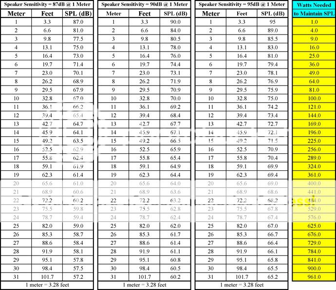 Álló hangfalat azért is szoktak venni, mert általában magasabb érzékenységi mutatóval rendelkeznek, mint az állványos hangsugárzók. Ez azt jelenti, hogy kevésbé terhelik az AVR-t. Belinkelek egy képet, ami azt mutatja, hogy a hangnyomás hogy viszonyul az érzékenységhez, a hallgatói távolsághoz és a szükséges teljesítményhez: