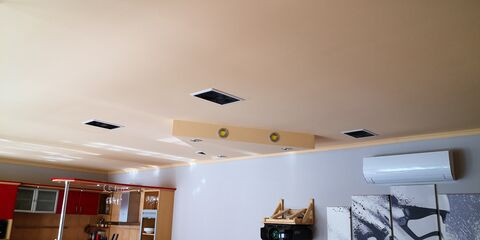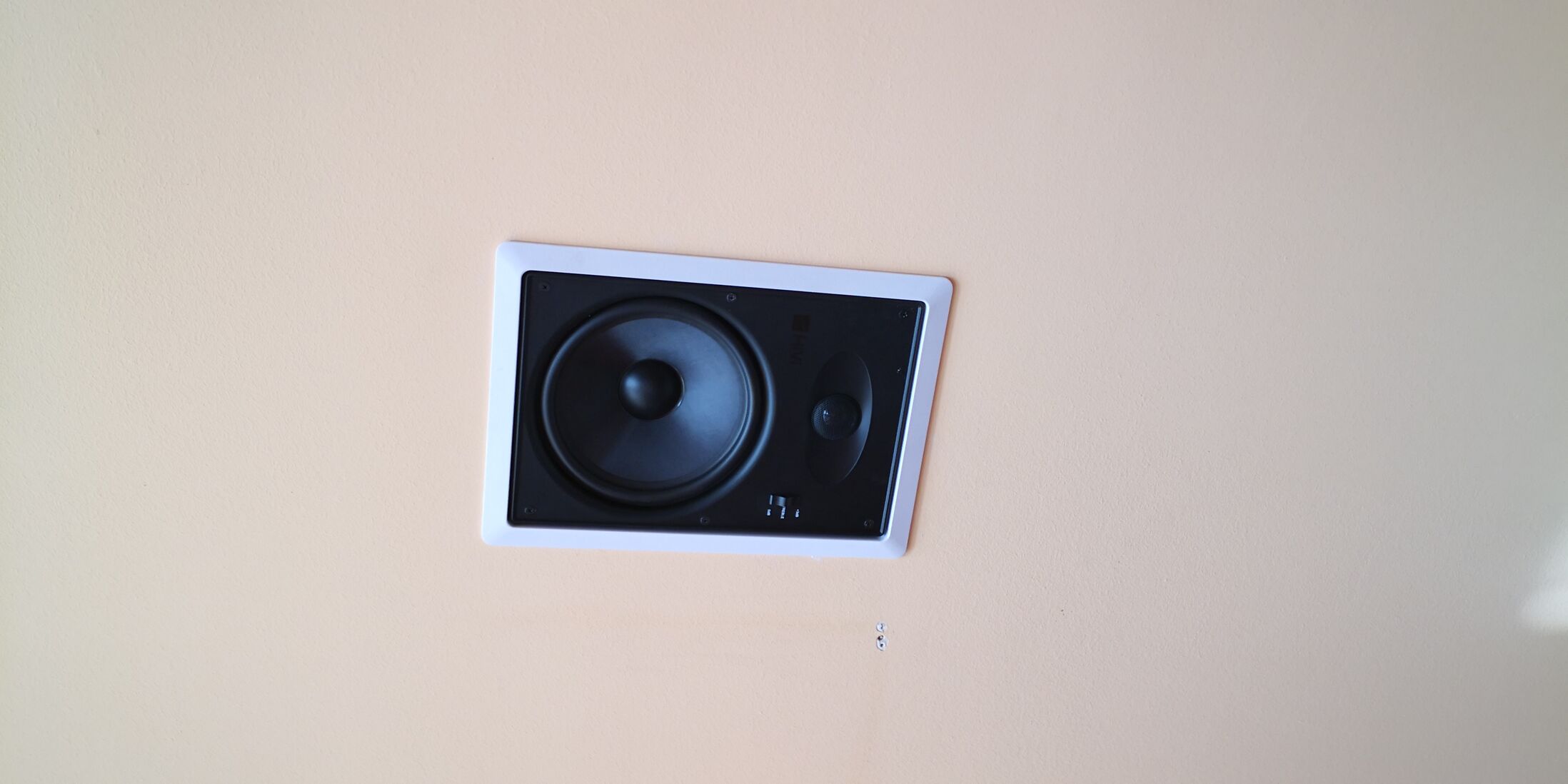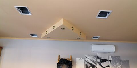Már csak el kell tüntetnem a próbafúrásokat, mert így határoztam meg a gerenda pozícióját. A két első hangsugárzót kb 30cm-re közelebb raktam egymáshoz mint a hátsót mert pont egy gerenda volt ott. A plafon 3,2 méterre van szerencsére elég nagy a belmagasság, így jó a burok. Amikor sztereó zenét hallgattam és ültem a fotelban nem tudtam különbséget tenni az első és hátsó között. Azt még nem írtam hogy egyenlőre 5.1.2 lesz. Később lehet 5.1.4-is csak ahhoz még erősítő kell.