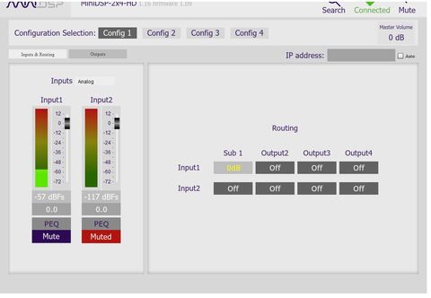 Így például tudsz olyat, hogy mindkét bemenet más EQ-val keveredik ugyanarra a kimenetre. Nagyon jó 2.1-eket vagy 2.2-ket lehet így csinálni sztereóból. Szobakorrekciónál persze bőven elég egy jelútnak venni egy bemenet-kimenet párost, amin együtt használod az összes filtert.