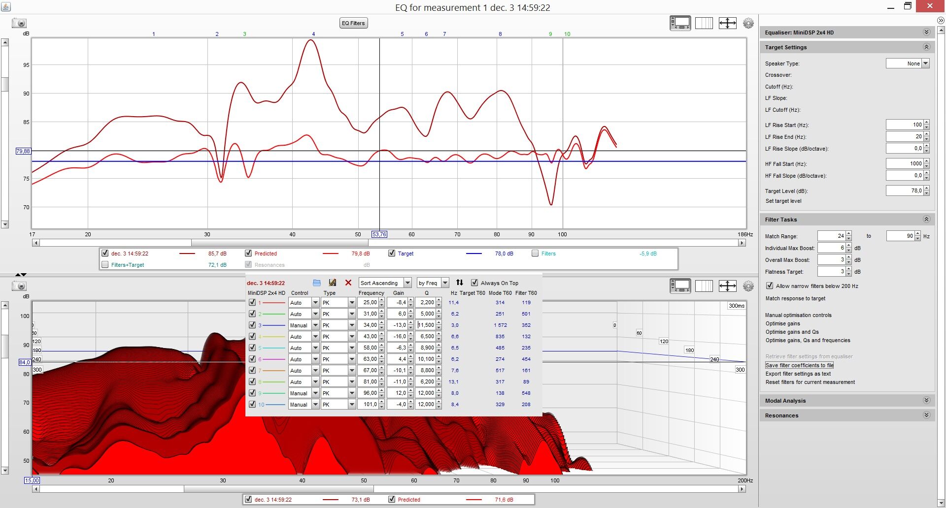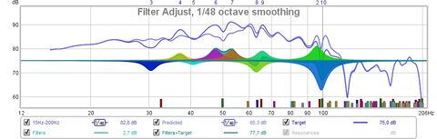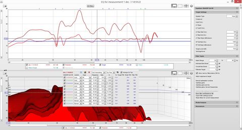 A MiniDSP mindig 100% headroomon működik, nem gond az erősítés. Arra figyelj, hogy amiket REW-ben megadsz, nem biztos, hogy megadhatók MiniDSP-n, főleg a nagyon kicsi Q-k és nagyon nagy erősítések, és ilyenkor két filter is kellhet. A görbével még játssz egy kicsit, bőven van még szűrőd, hogy egyengesd.