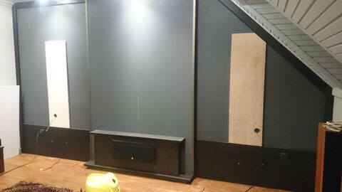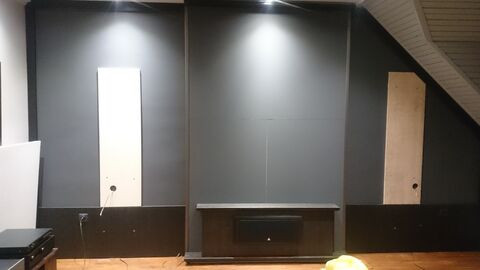 Igen a center beépítéséből tanulva, dupla falvastagságú retegelt lemezt kapnak a dobozok (2x18mm=36), amik a faltól elcsatolva 1x18mm-es rétegelt lemezre, speckó flex ragasztóval a faltól izolálva kerülnek rögzítésre. Így próbán a két szubnál a centeréhez hasonló torzítási adatok jöttek ki, és még nem voltak rögzítve a fali borításhoz, elcsatoláshoz.