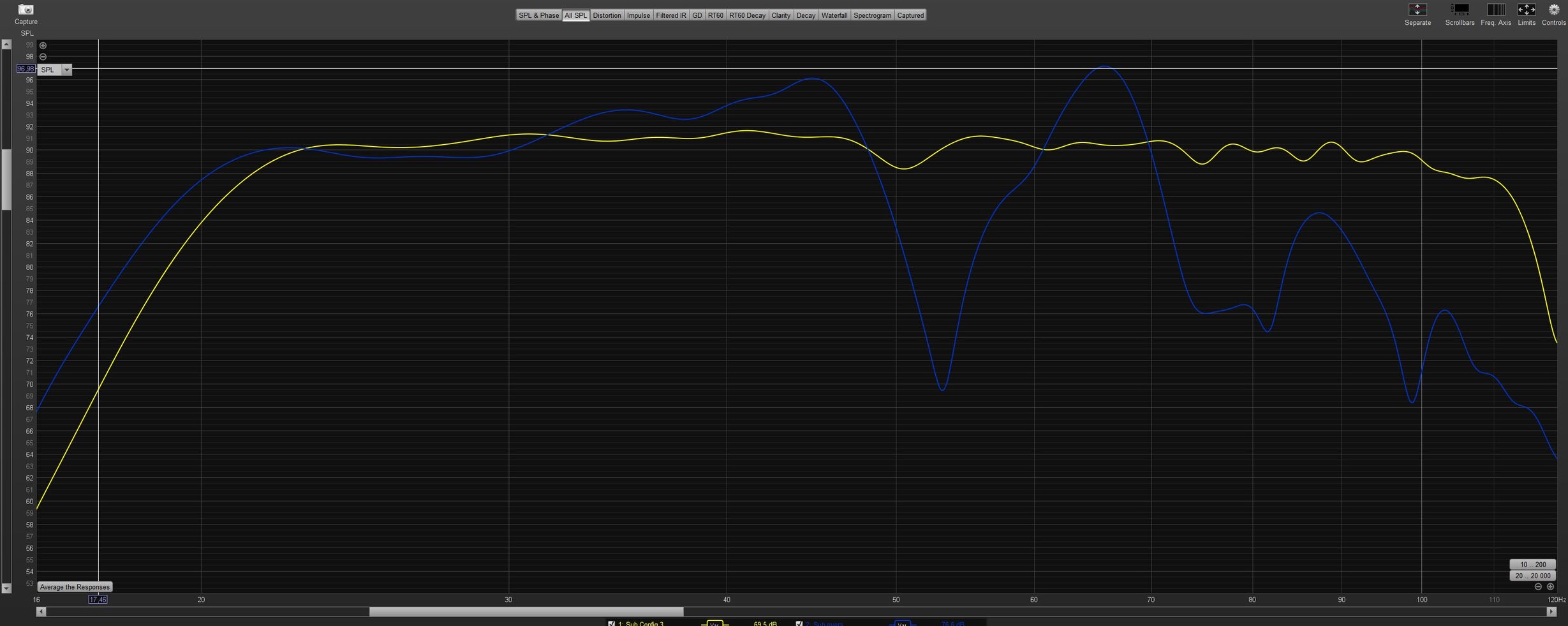 Kék az 5 sub együtt eq és delay nélkül, a sárga mit meg összehoztam. Most kipróbálom. -