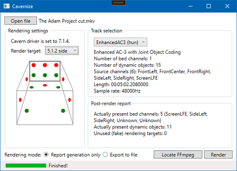 Az Atmos minden otthoni formája úgy működik, hogy az 5.1-ből vagy 7.1-ből egy kis segédinfó segítségével kikapja a plafonra, ami odavaló. A MediaInfo csak a csatornaadatokat képes dekódolni, illetve a dinamikus objektumok számát, de azt mindig beállítják a maximumra. Az erősítő csak azt írja ki, hogy melyik csatornákat lenne képes használni, hiszen nem tudja, hogy az egész film során bárhol lesz-e onnan hang vagy sem. Teljes elemzést csak ez a kis program tud csinálni, amiről betettem a képet, hamarosan ki fogom adni.