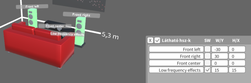 Na szóval, így van az.. toolban jól néz ki, de a lila a visszamért. Hétvégén talán lesz időm újra mérni, tologatni. Kipróbálom az 1 kimenetre fűzött 2 subot, meg a bal oldalit beteszem bal hátra a kanapé mellé, aztán meglátjuk.