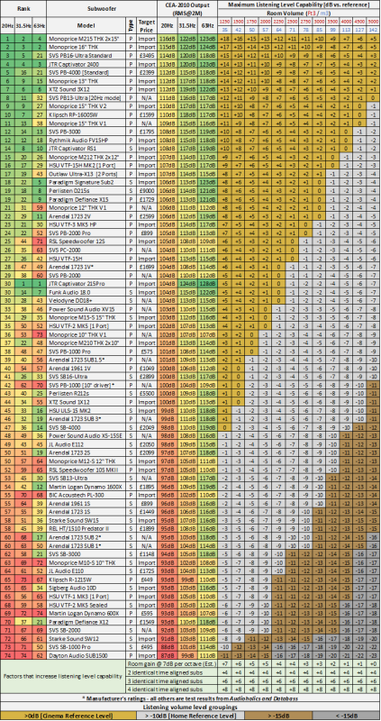Biztos, hogy reális elvárások ezek? Bolti új szub esetén a 4-500 ezer lassan a belépő kategória egyes márkáknál. A 20hz kergetése mindenáron meg nem biztos, hogy a legjobb irány. Azt azért ne felejtsd el, hogy ezek a cea2010 adatok 2 méterről vannak megadva, nem 1 méterről. 2m-en a 110dB-n 20hz-et csak 7 szub tud a 72-ből a táblázat szerint.
