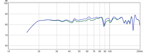 Folyamat: szub 0 fokra állítás -> AVR mérés -> REW zöld görbe, szub 90 fokra állítás -> AVR mérés -> REW kék görbe. A két REW mérés között umik elvéve, és visszarakva, pár cm különbség lehetséges.