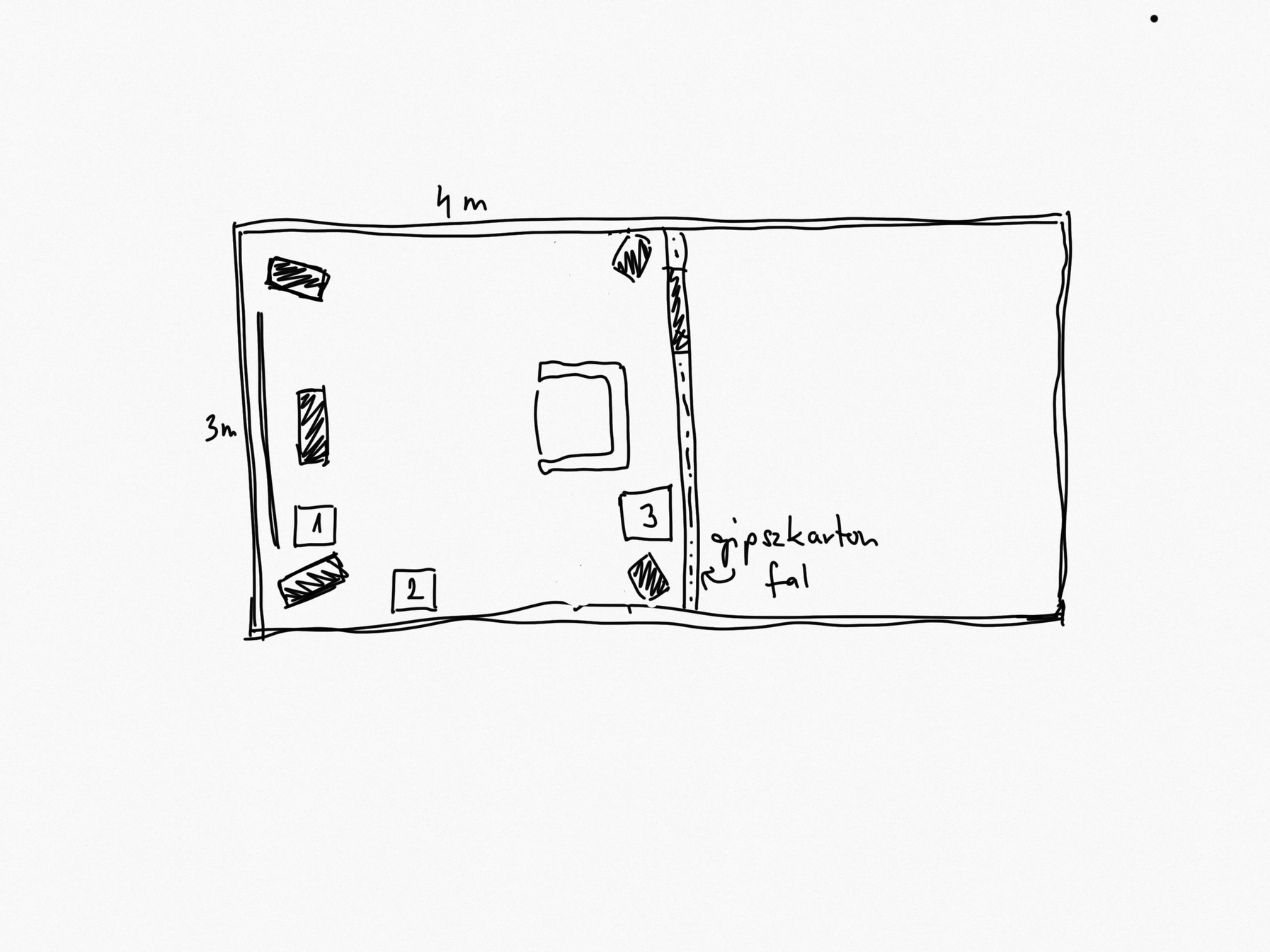 Az 1-es a legrosszabb, a 2-es jó, a 3-mas éppen csak kicsit jobb. Nem jó a rajz, mert a gipszkarton fal mögötti terület 5 és fél méter hosszú. A múltkori beszélgetés alapján az a helyiség is számít.