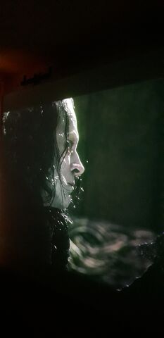Egy 2.58 m magas helyiségben, 2.8x1.58 m keretre feszített vászon. a plafontól a keret teteje 14 cm-re. A projektor lencséje 3.6 m-re van a vászontól.