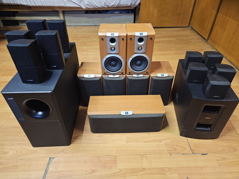 Kezdő házimozi rendszereim. Most Bose duplakockákat használok, centerrel, és chranch subbal, egy Onkyo HT-R358-assal hajtva. Ezek a polcon porosodnak addig. -