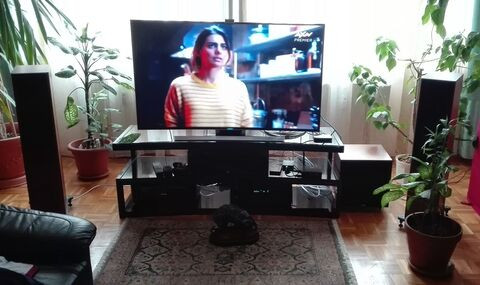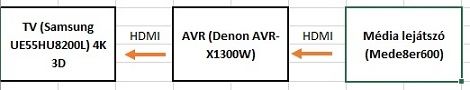 Van egy HU8200 TV, és egy Denon. A Denon és TV hang optikával van összekötve (azért nem HDMI ARC, mert a TV ARC bemenetére dugott HDMI útban van) . Van egy Mede8er lejátszó is, de az nem kezeli a 4K filmeket, így az UHD tartalmakat kénytelen vagyok a TV belső média lejátszójával kezelni.