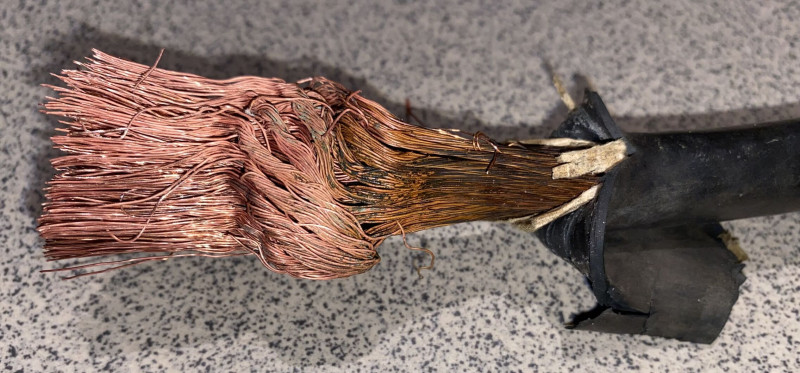 Mivel ez az öreg kábel az idők folyamán valószínűleg magába szívott némi nedvességet, aminek köszönhetően oxidálódott a külső rétege, ecetes-sós forró vízben megfürdettem a 2 végét, mielőtt bekötöttem a dugóba meg a csipeszbe. A képen a teszt fürdő eredménye látszik a levágott darabon. -
