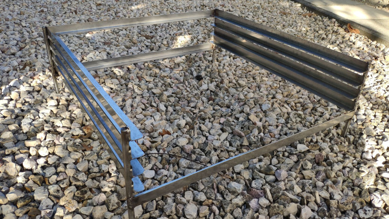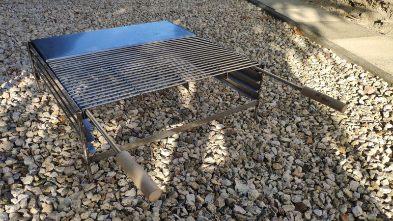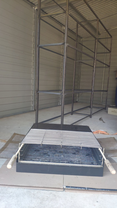 Aztán jön a váz, ez már full rozsdamentes, pont beleillik a tűztérbe. 4 magasság közül lehet választani. Egy tábla 1,5-es rozsdamentes lemezt vettem 2 éve, akkor még ki lehetett fizetni, olyan árak voltak. A szaki sok tonnás szabász géppel lecsapkodott belőle ~4cm-es csíkokat, és meghajtotta derékszögben, így lettek ilyen szögacélok. A láb 10-es vagy 12-es rozsdamentes köracél: