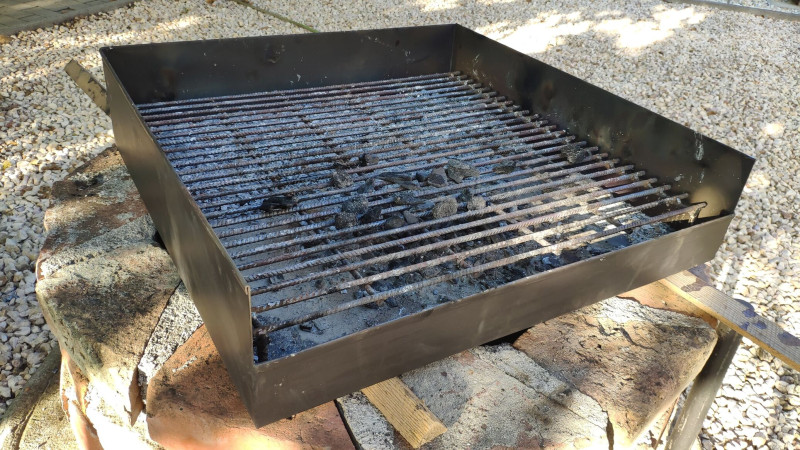 kívülről tűzálló festékkel fújva. 1,5-es lemez, de a szaki az éleknél behajtotta, nekem ez eszembe sem jutott volna. A faszén rács az én munkám, pont 3 szál 6-os betonacélt evett meg, de nagyon meg vagyok vele elégedve, szerintem király lett, az összepöttyintések alul vannak, annyira jól belejöttem, hogy egész szépek lettek. Kivéve a két széle, ami pont látszik, az még a kezdet, az elég gatya