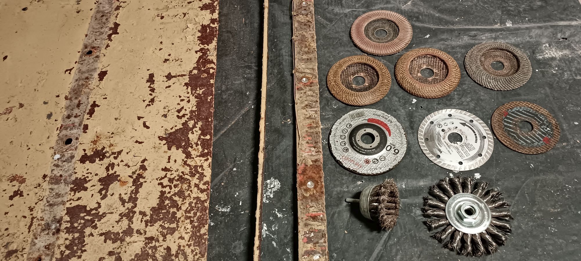 El nem tudom mondani, hogy rühellem azt a drótkorongot. De a munkát elvégzi. Az első festék nem vált be, úgyhogy az egyik nagykapu szárnyról is azzal kaptam le a 2 réteg alapozóval együtt. Volt, hogy az alsógatyámban is találtam szálat. Van egy régi vastag bőr kabátom, azt szoktam még felvenni felülre. Körkörös szivacstömítéses “búvár” védőszemüveg + a hegesztő sityka. Az is tele van becsapódási nyomokkal.