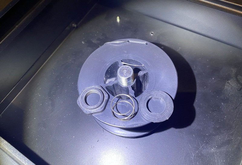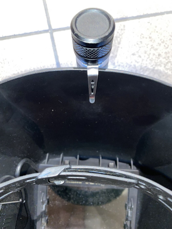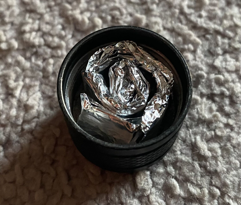 Az érintkező rugót kiszedtem, alufóliából csíkot hajtottam, majd feltekertem. Azt meg laposra kalapáltam az elemtartó kupakban. A vastagságot/mennyiséget ki kellett kísérleteznem, nem sikerült elsőre. Annyit gyömöszöltem bele, hogy a kupakot nem is tudom koppra visszatekerni. A lámpán belül a (+) érintkező is rugós, úgyhogy annyira nem para a fólia pontos mennyisége.
