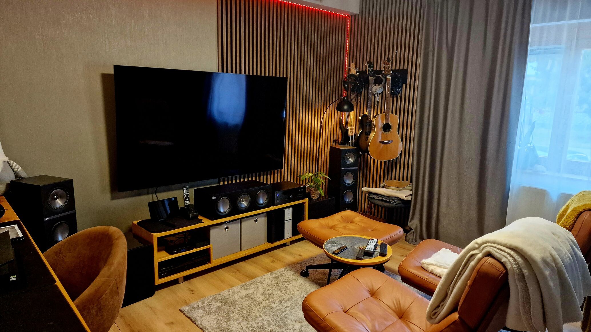 A sztorim lényege, hogy pár éve feladtam a nappalit (mint zenehallgatós/filmnézős helyiséget), túl sok kompromisszummal járt. A vendégszobára fókuszáltam, a cél az volt, hogy a család egyéb tagjanak tevékenységétől függetlenül és zavartalanul lehessen mozizni, zenét hallgatni egy rendszeren ami mindkét funkcióra alkalmas. Többkörös eszközcserebe és helyiségátrendezgetés után nemrégiben éreztem úgy, hogy technikailag készen vagyok, már csak némi esztétikai pofozgatásra van szükség, tapétáztam, bútorokat csináltam, és hát ez lett belőle :link . Itt annyi kompromisszumra volt szükség, hogy a hallgatói pozíció mögött faltól-falig gardróbszekrény van, így a hátsó hangfalak (7.2 a rendszer) és a projektor elhelyezése némileg korlátozott. Bár lehet a gardrób akusztikailag még előnyös is. -
