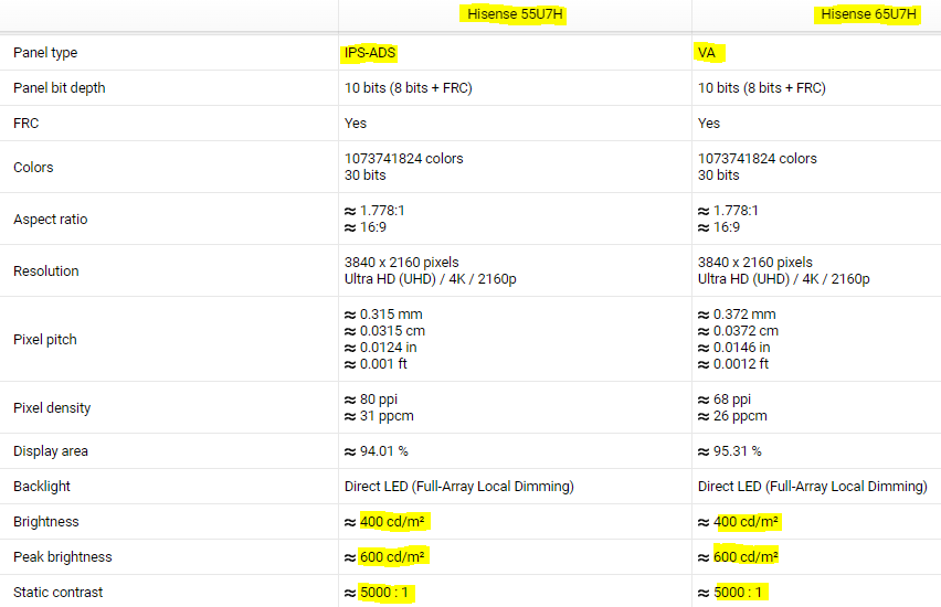 Osszehasonlitottam az 55U7HQ -t es 65U7HQ -t a Displayspeciations oldalon.