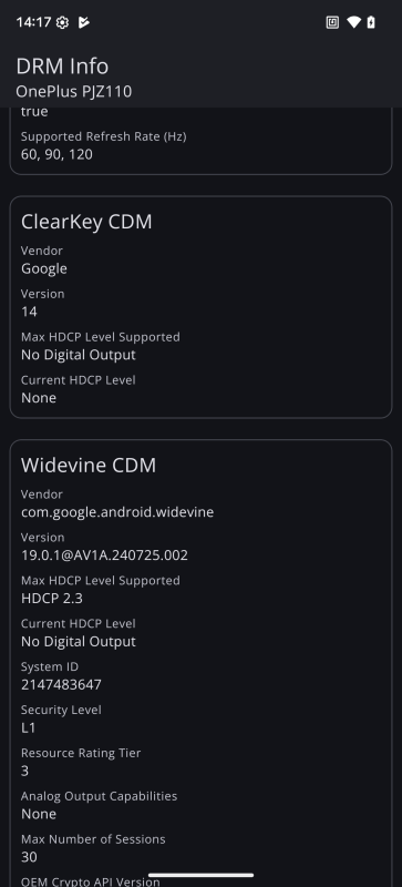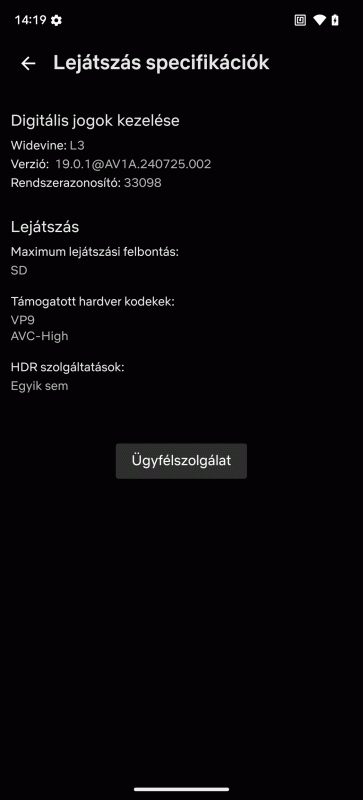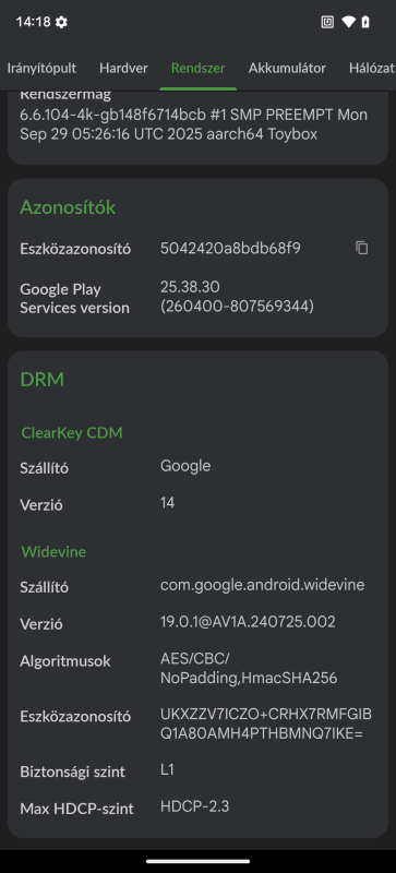 Viszont, amit nem értek - többször kérdeztem itthon, külföldön is. Sajnos lehet én értettem félre, de a Widevince tanúsítás nem L1 feloldott bootloader után. A DRM apk azt írja, de valójában, gyakorlatilag a Netflix L3 -t mutat, SD minőség :/