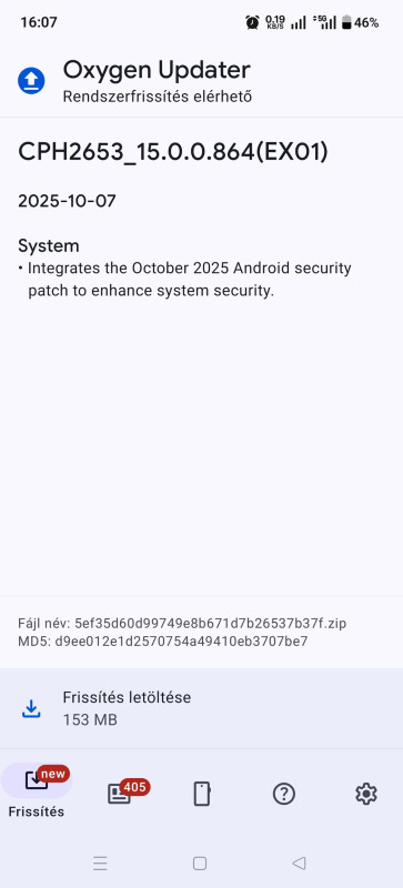 Oxygen Updater jelzett egy 160 megás patchet, csak az októberi biztonsági patch van benne.