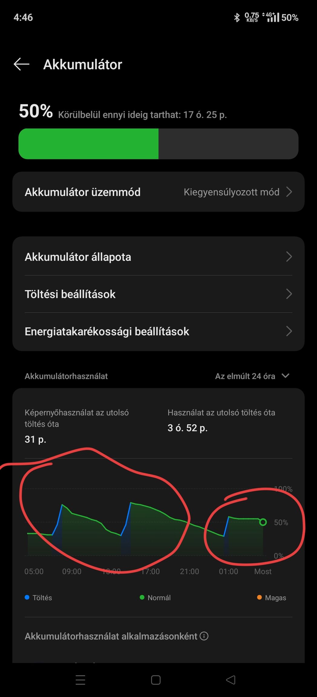 Ha esetleg estére lemerülnék teljesen akkor lökök bele annyit, hogy reggelig kibírja. Nem figyelem, hogy 30-80 között legyen mivel 6000mAh-s akkuért fizettem, nem 3000mAh-ért.Töltések 90%-a lassú töltés azaz max 25W. 10%-a 50-100W. Vezetéknélküli töltés nyáron felejtős. A mágneses hűtőpados töltővel simán 40fok fölé megy az akksi. Szerintem el fogom adni mert igazából felesleges nekem.