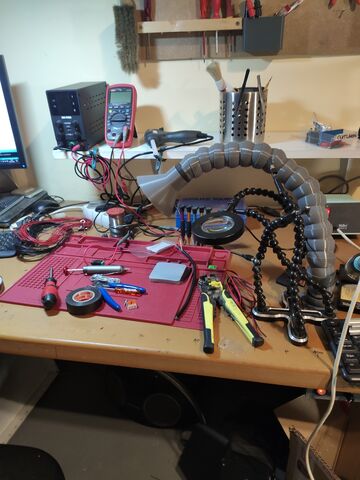 még a szűrőjét meg kell építenem a motor köré ami egyben kicsit a hangját is elnyomja majd. De már az is haladás hogy nem az arcomba megy a füst. Az az asztali elszívó nekem túl sok helyet foglalt. Van olyanom is. Teljesen 3d nyomtatott az elszívó cső, alul 40es PVC. Mit gondoltok? [kép]