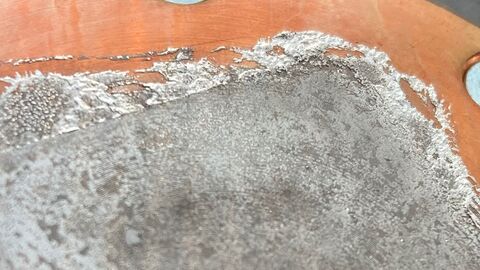 A réz talpról nem lehetett lefaragni sem, mélyen beépült a rézbe. Ki lehetne síkoló csiszolással és polírral hozni, de ez a szivattyútalp szándékos domborulatát is kisíkolná, amit a gyár a körkörös esztergálással alakított ki.