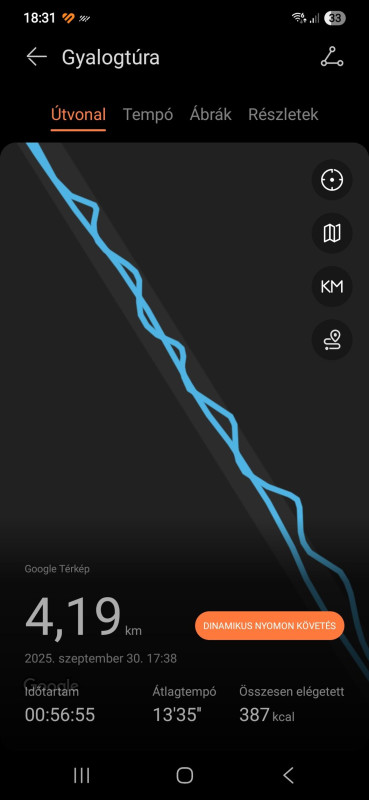 Tegnap csak a Fit4pro-val mértem a séta egy részét (nem az indulásnál inditottam el, hanem kb 500 méterrel később. Az igy is látszott, hogy távolságban többet mér. A pontossn 4 km-t 4,19-nek mérte, úgy ,hogy cirka 500 méterrel később indítottam a mérést, tehát kb 3,5-öt kellett volna mérnie. De a térképen jól rajzolja az útvonalat. Ime egy részlet: 3 méter széles földúton kb 20 méter hosszan "S" vonalban sétáltam az út egyik szélétől a másikig. Igy rögzitette: