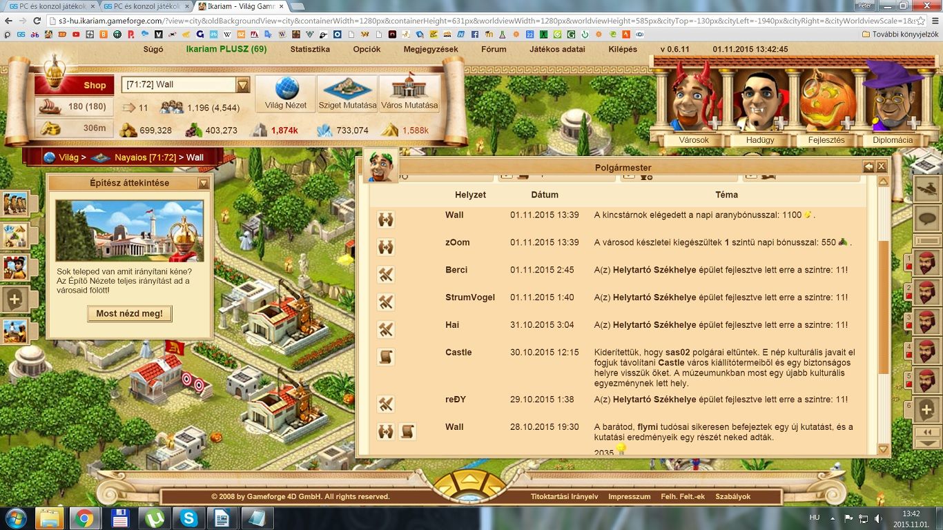 Tart a 33-as városháza projektem. Egész jól megy. Már csak egy városban kell építgetnem. Aztán jöhet a borozófejlesztés, hiszen valamivel be kell csábítani az embereket.