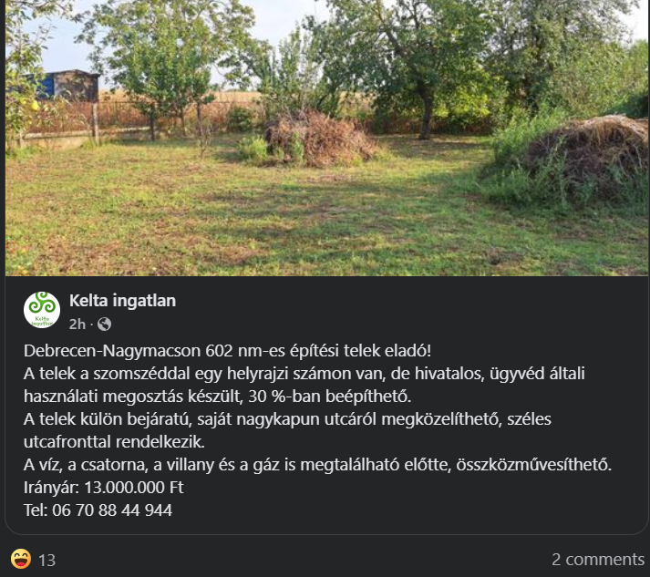 Összehasonlításképp a csak kicsit rosszabb állapotú szülői házunkat 1, azaz EGY millióért tudtam 2021ben eladni az alföldön. 2x ekkora telekkel.