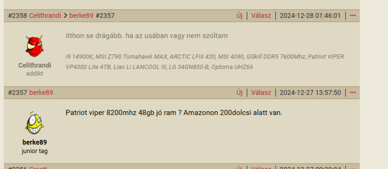 Akkor valszeg felreertetted a hozzaszolasokat,igy te az alaplapra gondoltal,es nem a memoriara.Mivel te az egyik hszre reagalva irtad,hogy 80k-ert tudsz DDR5 memot venni itthon is.(berke 89 hsz-re reagaltal,aki ezt irta:-Patriot viper 8200mhz 48gb jó ram ? Amazonon 200dolcsi alatt van.)