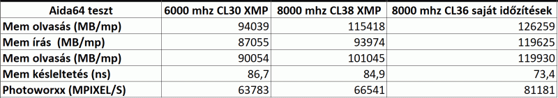 Még kicsit hangolgattam és sikerült az is, amit nálad is láttam, hogy az olvasás írás értékek közel állnak egymáshoz. Most már nekem is így néz ki. Majd még kipróbálom még azt is amit írtál, de a ram házhűtés állítgatása után is 59fokig eljut stresszteszten játékok alatt meg 56-57fok. Annyira nem optimális a hűtés/szellőzés nálam ehhez a ram tuninghoz, de sztem 8000 mhzen ezek már annyira nem rossz eredmények, 1,5 napi hideg élelem kellett hozzá: