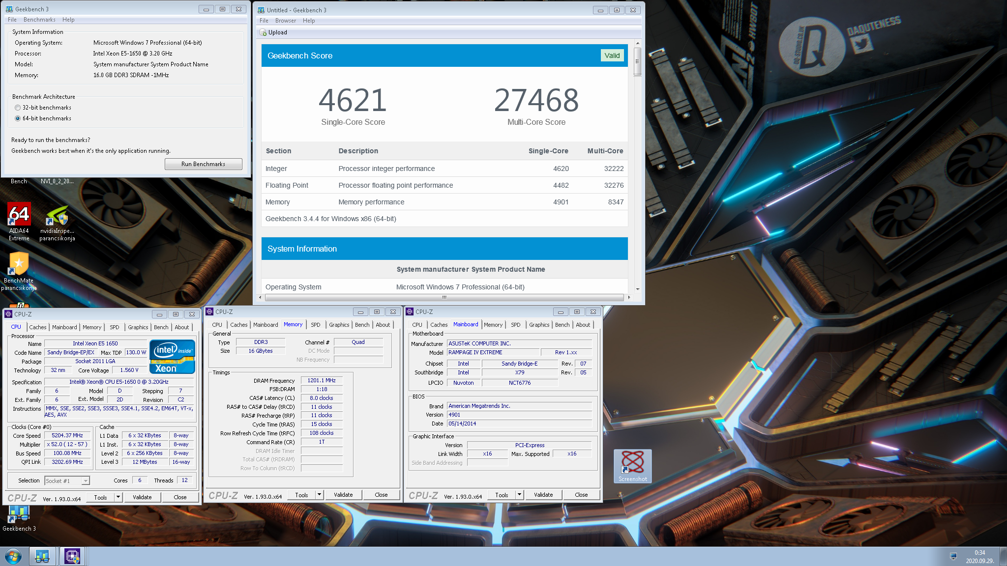 Benchelgettem az imádnivaló lappolt E5-1650-em a Rampage IV Extreme-ben és egy olyan ram IC-s ramot használtam, amit kurrens időkben soha senki nem használt benchmarkra, meg így mindennapos tuningra sem, valahogy elveszett a PSC-k (2x2 GB-os, két oldalas, ergo 1 Gbit-es chipes 2000C6, 2200C7, 2300C8, 2400C9, stb speckójú, legtöbbször G.SKill PI modellek) és később a Samsung "Rev-D" (mai szlenggel élve D-die) modellek (2x4GB, két oldalas, ergo 2 Gbit-es IC-k vannak rajtuk, 2400C9, 2600C10, 2666C10 spec G.Skill TridentX, RipjawsZ, stb) között.Vettem egy tálca OEM, mezítlábas Samsung ún. G-die-t, ezek hasonlóan a PSC-khez 2 oldalas kiszerelésben 2 GB-os, 1 Gbit-es IC-s ramok és egy angol, hwbot-on aktív srác talált rá az chip tuningosságára 1-2 éve.