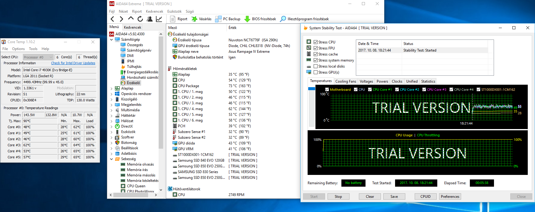 A hőmérsékletek 50-60c' között Aida64 streszteszt alatt. A CPU Package ment egyszer fel 71C', de csak egy pillanatra és többnyire 60-64C' között ingázik.