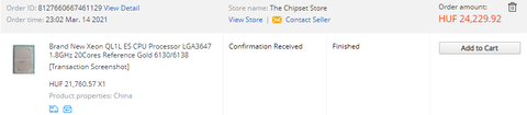 Ebayen volt sok amazon szerverből selejtezett Xeon Platinum P-8124 SR2YS ami egész jó lett volna 69eft-ért de nekem kiesett a 240w tdp miatt, 18 mag 3,4ghz all core turboval.