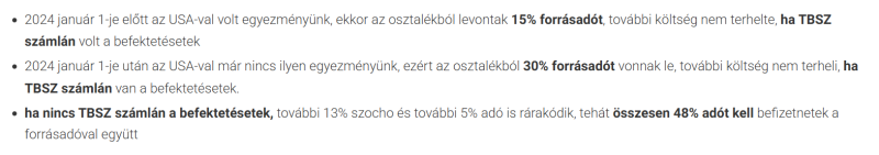 Itt az a sor az érdekes, ahol TBSZ-en tartasz osztalékfizető részvényt, amiből a kifizető állama levonja az adót, azt be kell vallanod itthon, de nem kell adóznod utána. Pl. az IBKR részvény osztalékából az USA levont 30% adót, és normál számlán még itthon fizetned kellett 5% szja-t. TBSZ-en csak be kell vallani, hogy 30%-ot kifizettél az USA-nak, és kész.