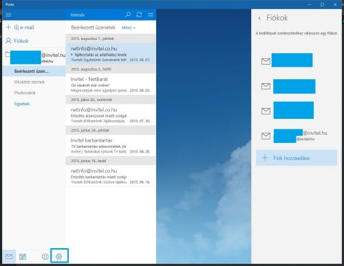 Posta Modern UI-s alkalmazás - bal alsó sarok, fogaskerék jel - Beállítások - Fiókok