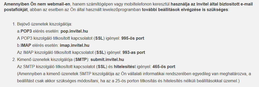 Megjegyzés 2: Amennyiben nem IMAP hanem POP3 elérést akarunk beállítani, akkor a szükséges adatok a szolgáltató oldaláról ezek függvényében változnak:
