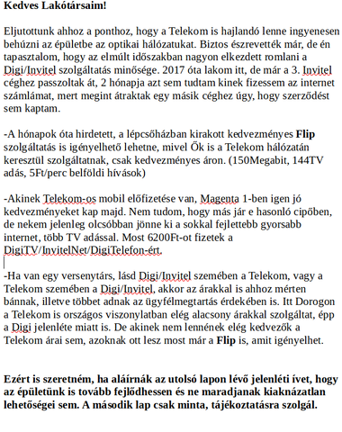 Telekom végre felhívta a közös képviselőnket. Külön megbízott, ezért szarik az aláírágyűjtésbe, úgyhogy elkezdtem én. Remélem nem szivatnak meg, végre mehetne a Telekom 1000/1000