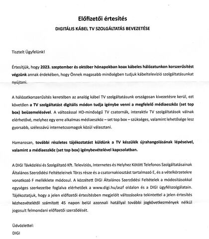 A levélben egy szó sem esik a CA kártyáról, így én úgy vélem hogy csak set-top-box lesz a megoldás TV nézésre. Holnap felhívom a DIGI-t, amennyiben ez igaz, és nem lesz lehetőség CA-modul használatára, akkor holnap fel is mondjuk a szerződést.