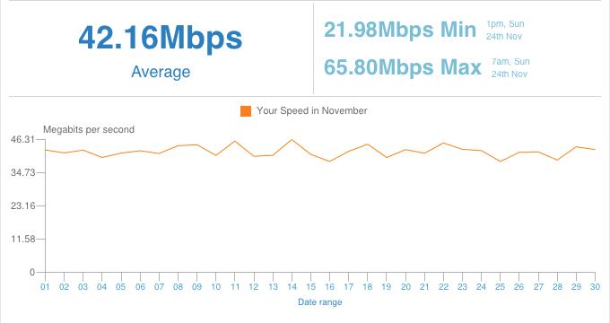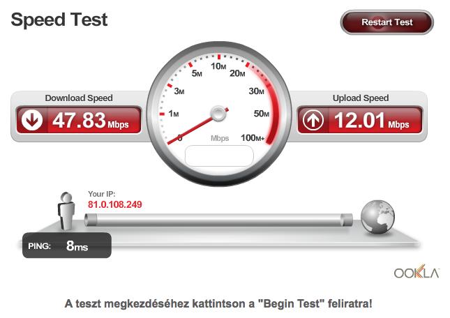 Átlagos letöltési sebesség : 49.47Mbps (Min 26.36Mbps, Max 69.91Mbps)