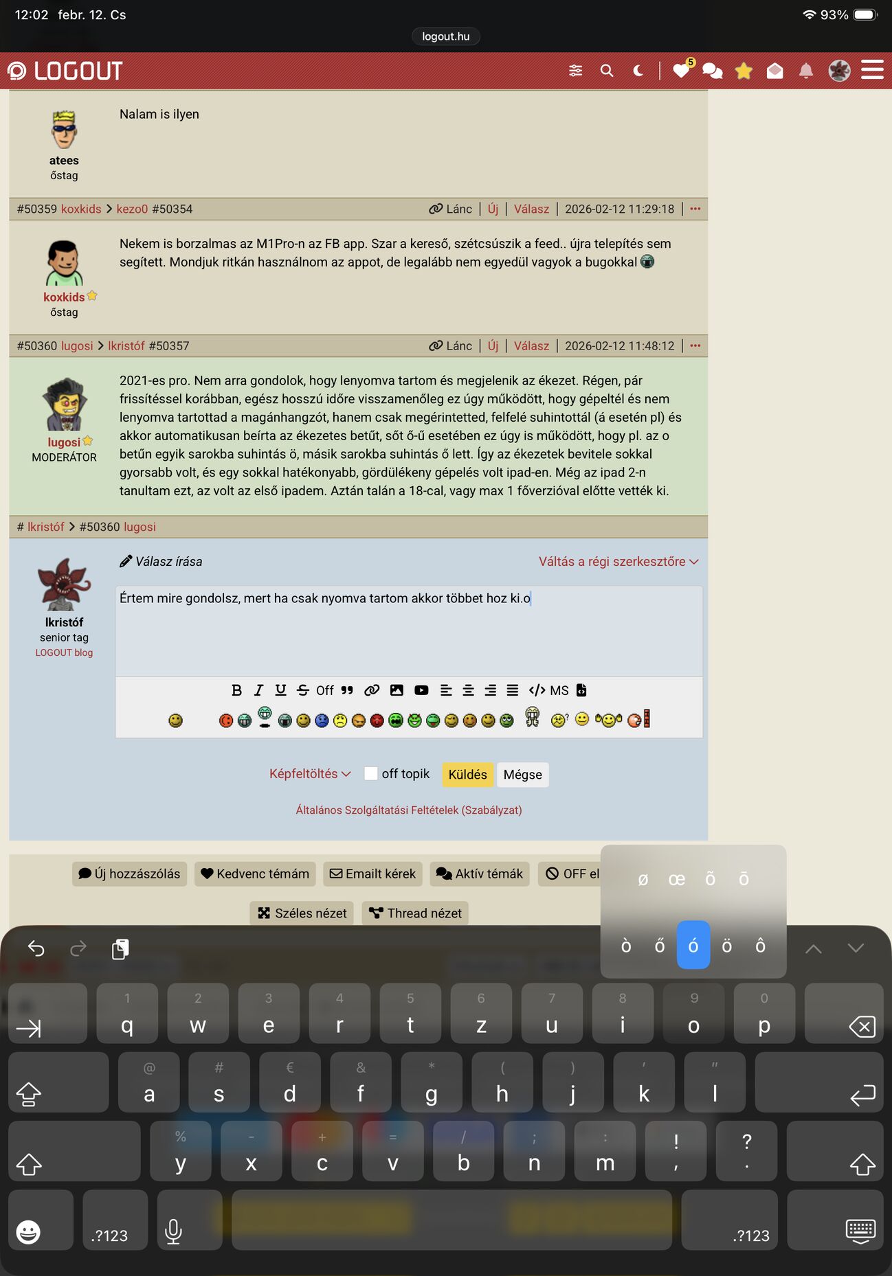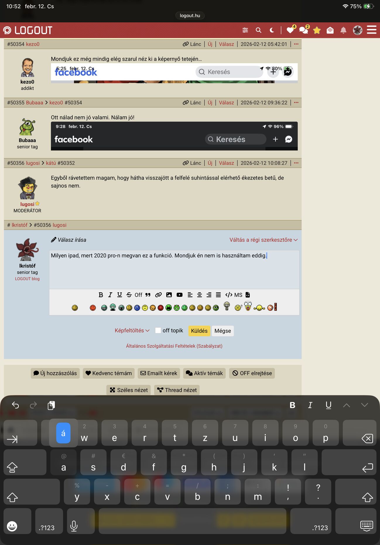 Kedd óta használok egy 11es iPad Pro-t, nem vettem még észre, hogy gondot okozna, most kipróbáltam, hogy jelentősen beljebb fogom, hogy a kijelzőhöz hozzá is érek, és úgy is tudtam görgetni, nagyítani, nem tűnt el a billentyűzet. Szóval biztos van benne alapból valamiféle "palm rejection" vagy hogy is hívják ezt a funkciót, mint pl egy lekerekített kijelzős telefonnál. [kép]