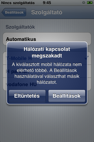 Ma reggel nem tudtam hívást indítani, újraindítás után "Nincs szolgáltatás" fogadott ,a szolgáltónál a T-Mobile-t kiválasztva (percekig tölt ott is) ez a kép fogad: