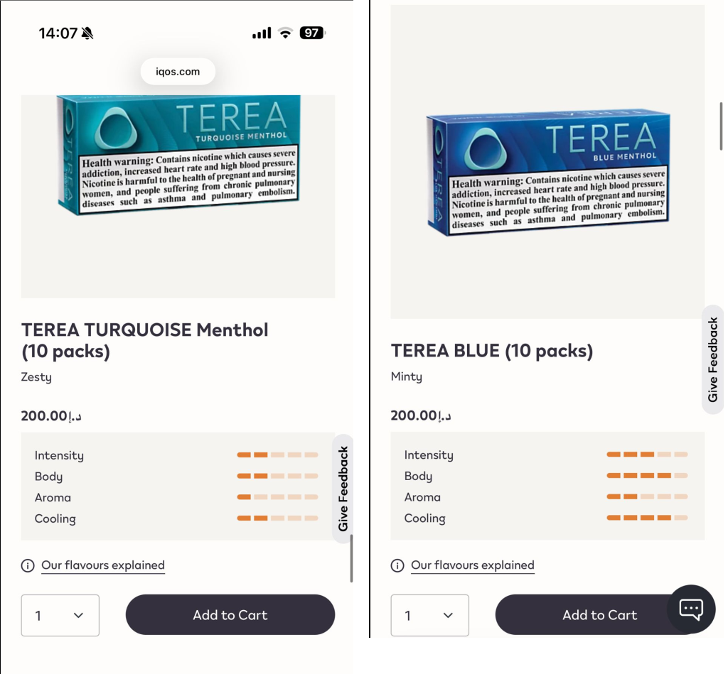 Továbbá a TEREA és DELIA dohánytöltetekkel kapcsolatban informáljuk, hogy a dohánytöltetek különböző dohányok gondosan válogatott keverékéből készült, mivel az a célunk, hogy olyan ízt és dohányzási érzést kínáljunk, amely a lehető legközelebb áll ahhoz, amit a felnőtt dohányosok megszoktak, bár a dohánytöltet íze különbözik a cigarettáétól és nem érdemes összehasonlítani őket.