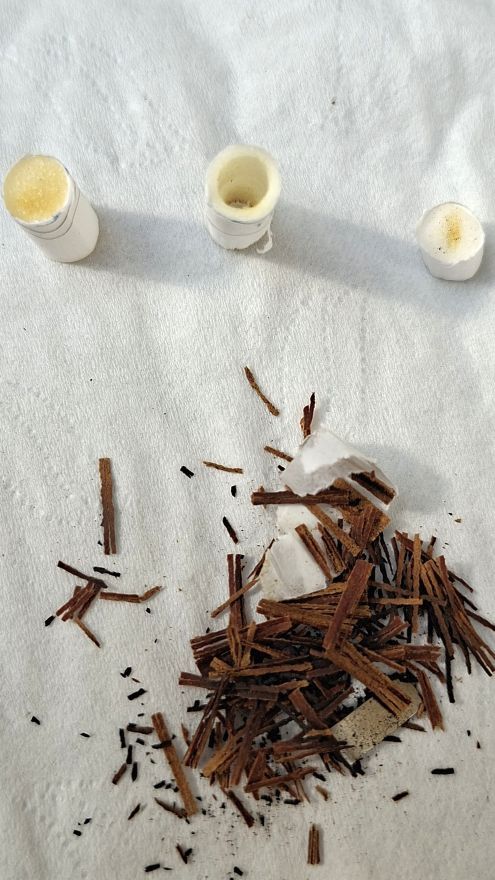 (Látható a 2 végén található záró elem, a szűrő és légcsatorna, valamint a dohánytöltet - aminek a borítását leszedtem - a hevítőlapkával.)