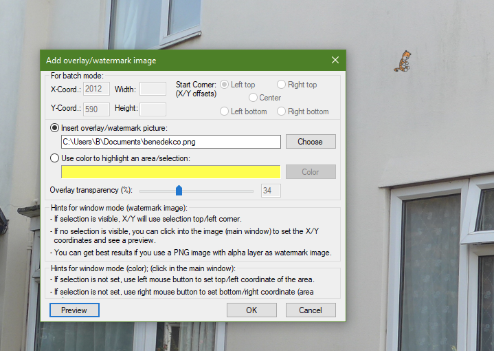 Sziasztok! Már régóta használom az irfanviewet. Most viszont az a problémám, hogy vízjelezni szeretnék képeket, de nem tudom beállítani, hogy hova helyezze a vízjelet a progi. Vízjel/Fedőszín beszúrásánál nem tudom beállítani a Start-sarok: X/Y Offsets - et. Ráadásúl a legújabb verziónál már a kötegelt módhoz való dolgokat se engedi szerkeszteni. Erre esetleg valami megoldás? Előre is köszönöm!!!