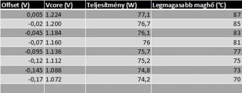 Volt egy kis időm és tesztelgettem. Arra voltam kíváncsi, hogy az offset beállítás mennyire csökkenti a processzor fogyasztását, illetve mennyire csökkenti a magok hőmérsékletét. A teszt eredményeként megállapítható, hogy fogyasztás minimálisan, de a hőmérsékletek jelentősen csökkentek!