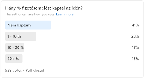 a 3 havonta fizetésemelésen rugózoknak próbáltam kikeresni, linkedin-en szembejött egy hazai poll a minap, egy IT headhunter cég HR-esei kérdeztek körbe, IT területen hányan és mekkora mértékű fizetésemelést kaptak. Olyan 1000-2000 közötti mintánál jártak.