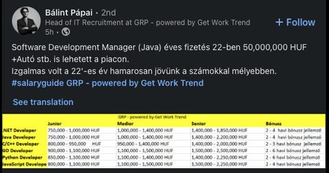 Köszi a válaszokat, örülök hogy beszélgetést generált - ezért is kérdeztem, mert a jelenlegi lehetőségeket látva nagyjából 950-1.2 között lehetne pályázni (tavalyi Hays alapján ez a junior teteje, medior alja), de az 1M elérhetőnek tűnik.