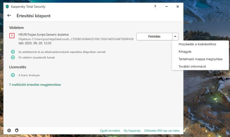 Kaspersky Total Security-t használok 21.3.10.391 verzióval. Már nem is emlékszek rá mikor volt riasztás bármire, aztán ma jött egy.