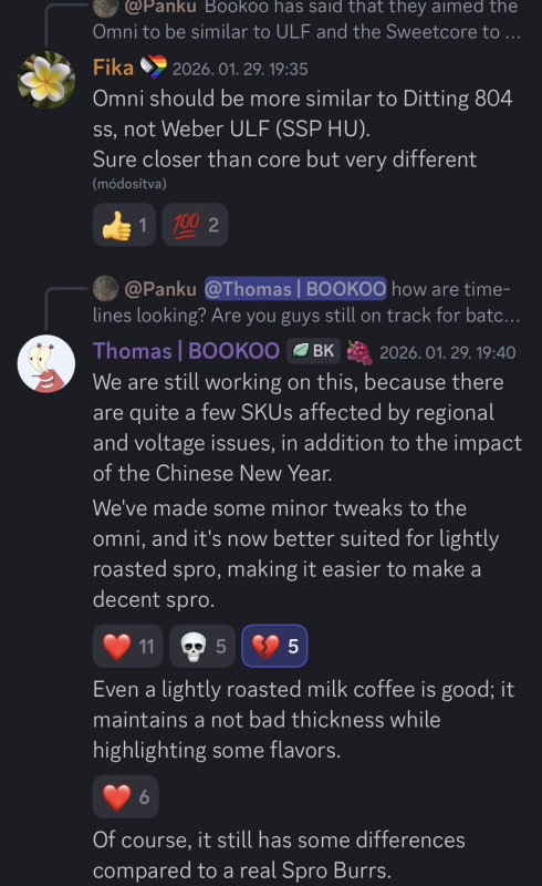 Csúszik, ahogy szoktak az ilyen első körös dolgok. Most épp újév van kínában, ez ott a legnagyobb ünnep, nem készültek el előtte így most áll a projekt. Viszont előtte készült egy kisebb batch, amit kiküldtek a kínai első körös vásárlóknak hogy az arra kapott visszajelzésekből bármi hiba már ne legyen a nyugati világnak küldendő első, és majd második körös termékekben. Az omni késen kicsit változtattak, a saját állításuk szerint ugyanolyan jó maradt filterre de jobb lett presszóra
